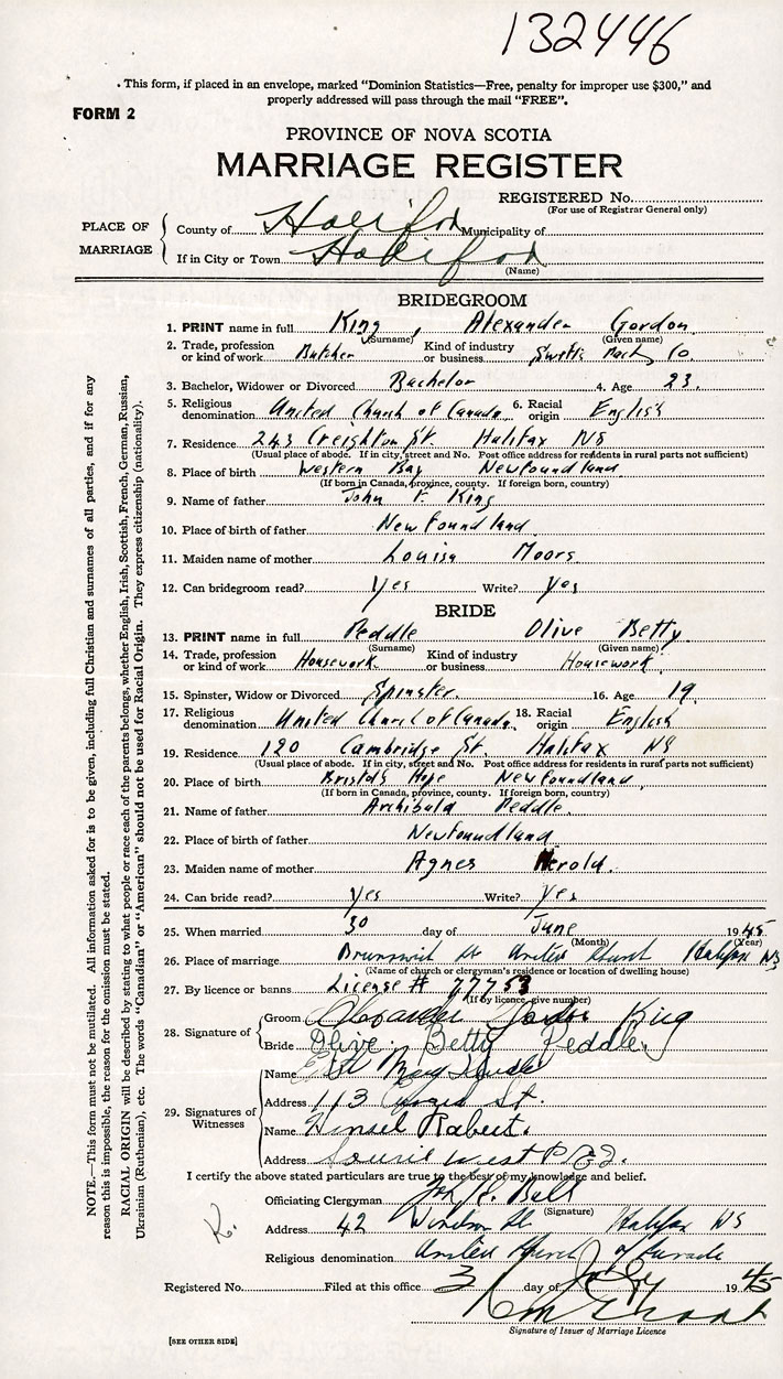 26. Place of marriage Brunswick St. United Church Halifax, Halifax County
