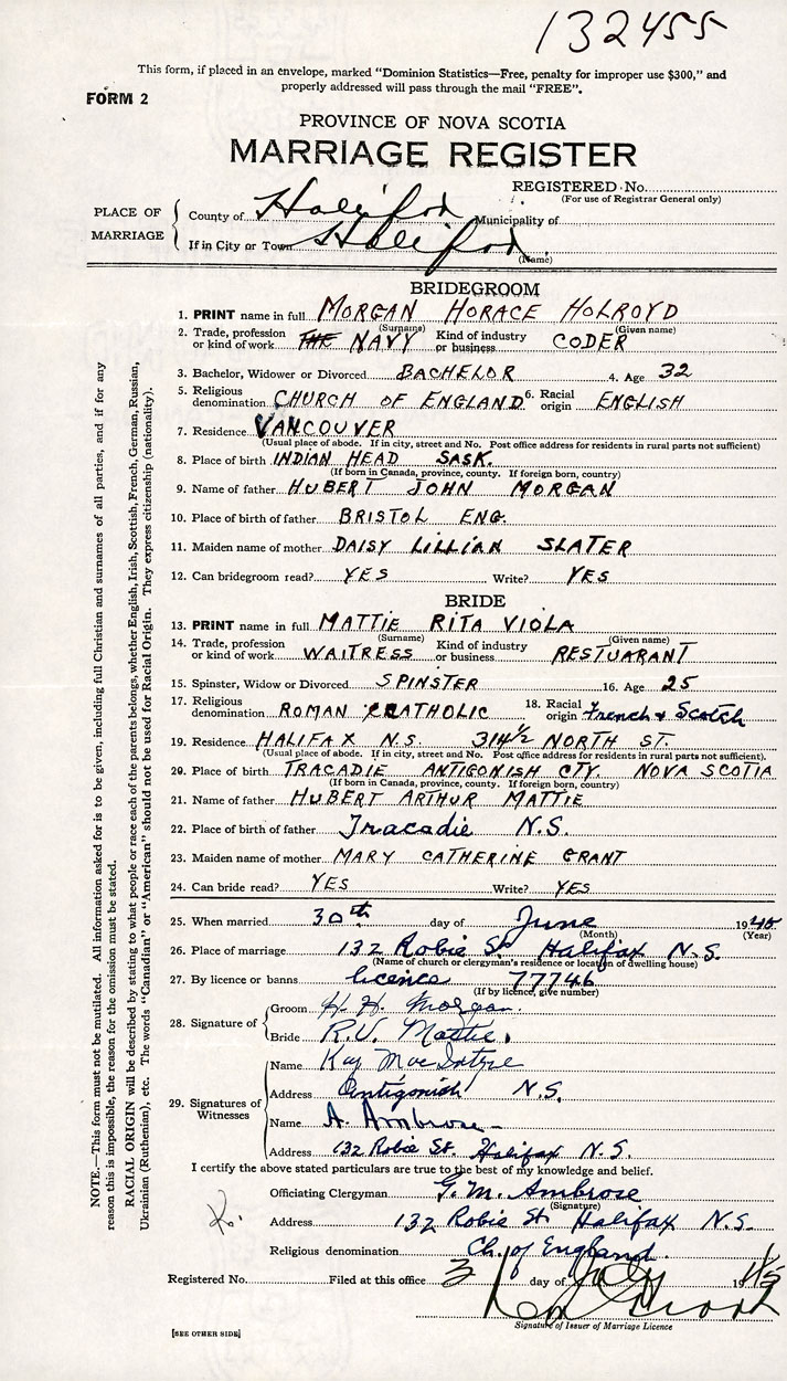26. Place of marriage 132 Robie St Halifax , Halifax County
