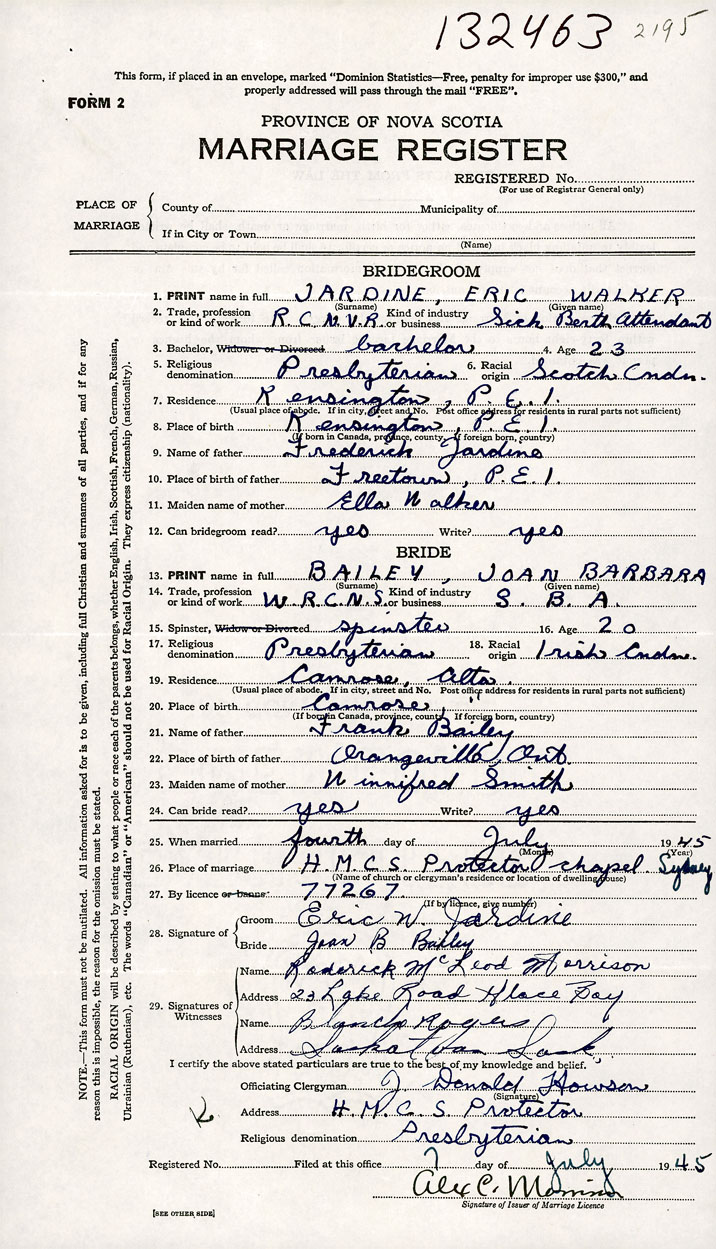 26. Place of marriage HMCS Protector (Naval Base) Sydney, Cape Breton County