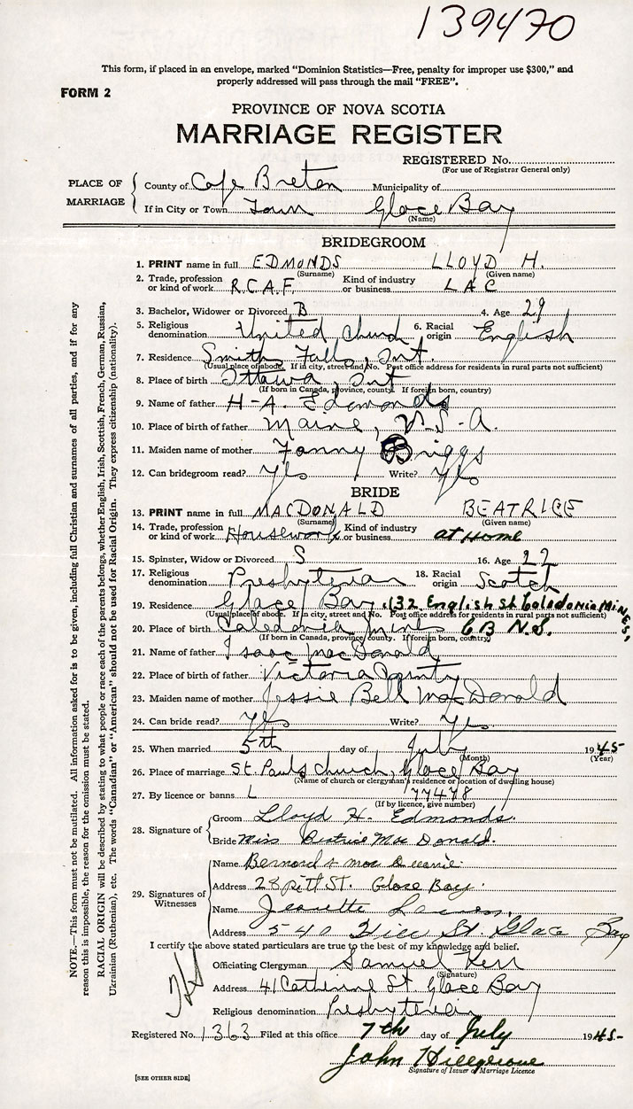 PLACE OF MARRIAGE County of Cape Breton in City or Town Glace Bay