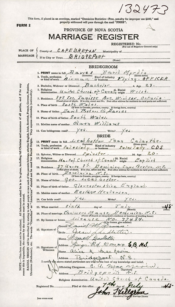 26. Place of marriage Chalmers Manse Dominion, Cape Breton County