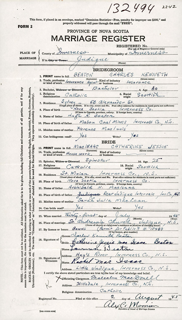 26. Place of marriage St. Andrew's Church Judique, Inverness County