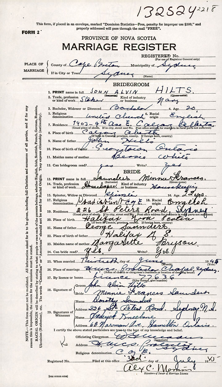 26. Place of marriage HMCS Protector (Naval Base) Chapel Sydney, Cape Breton County