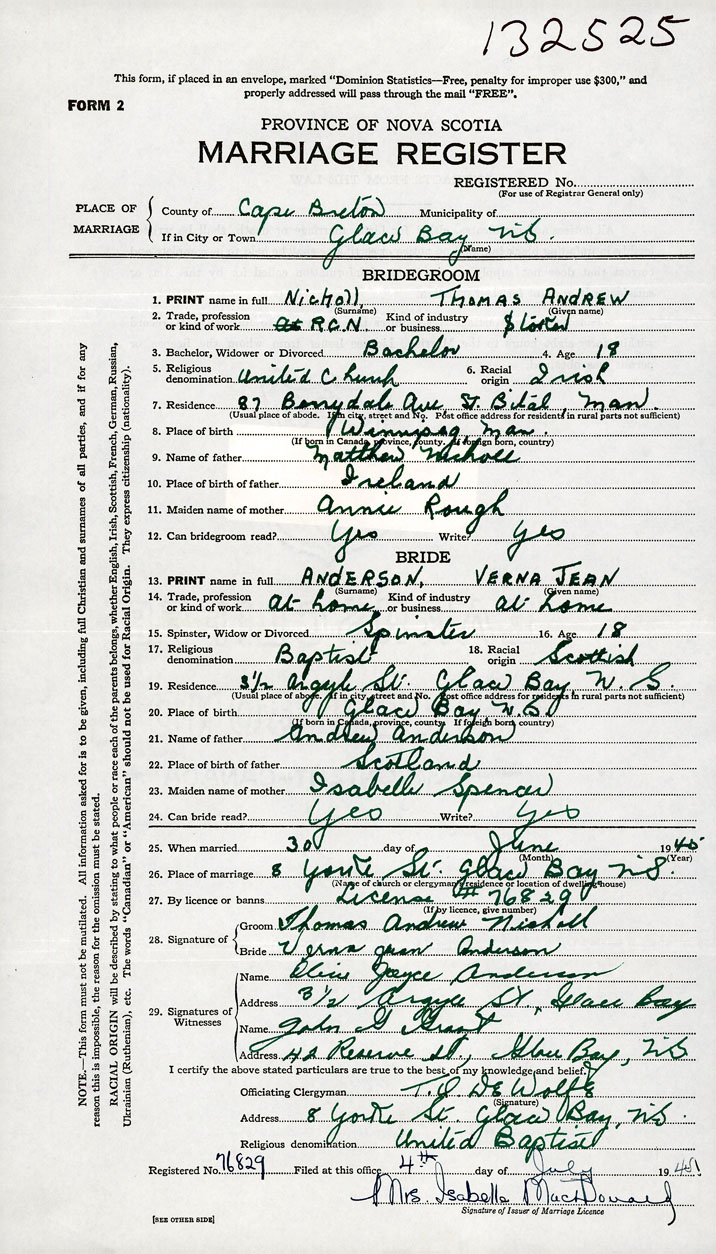 PLACE OF MARRIAGE County of Cape Breton in City or Town Glace Bay