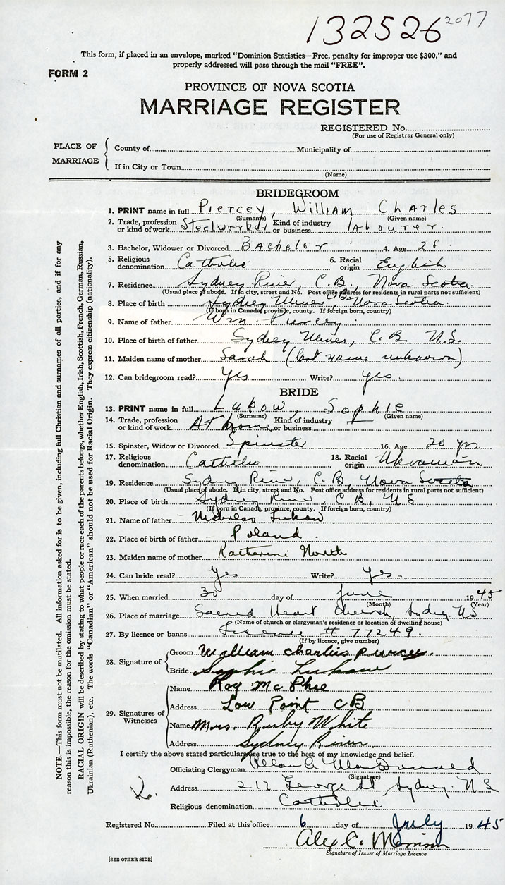 26. Place of marriage Sacred Heart Church Sydney, Cape Breton County