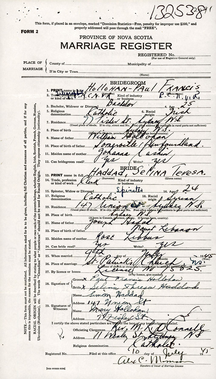 26. Place of marriage St. Patrick's Church Sydney, Cape Breton County