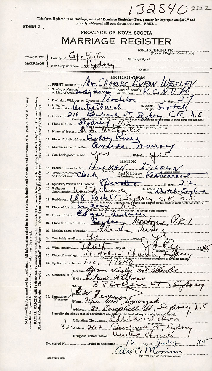 26. Place of marriage St Andrew Church Sydney, Cape Breton County