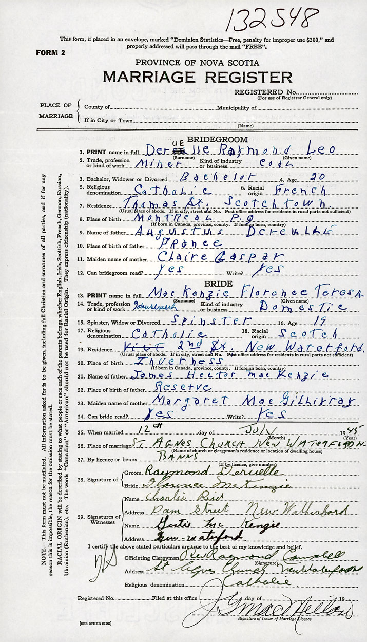 26. Place of marriage St. Agnes Church New Waterford, Cape Breton County