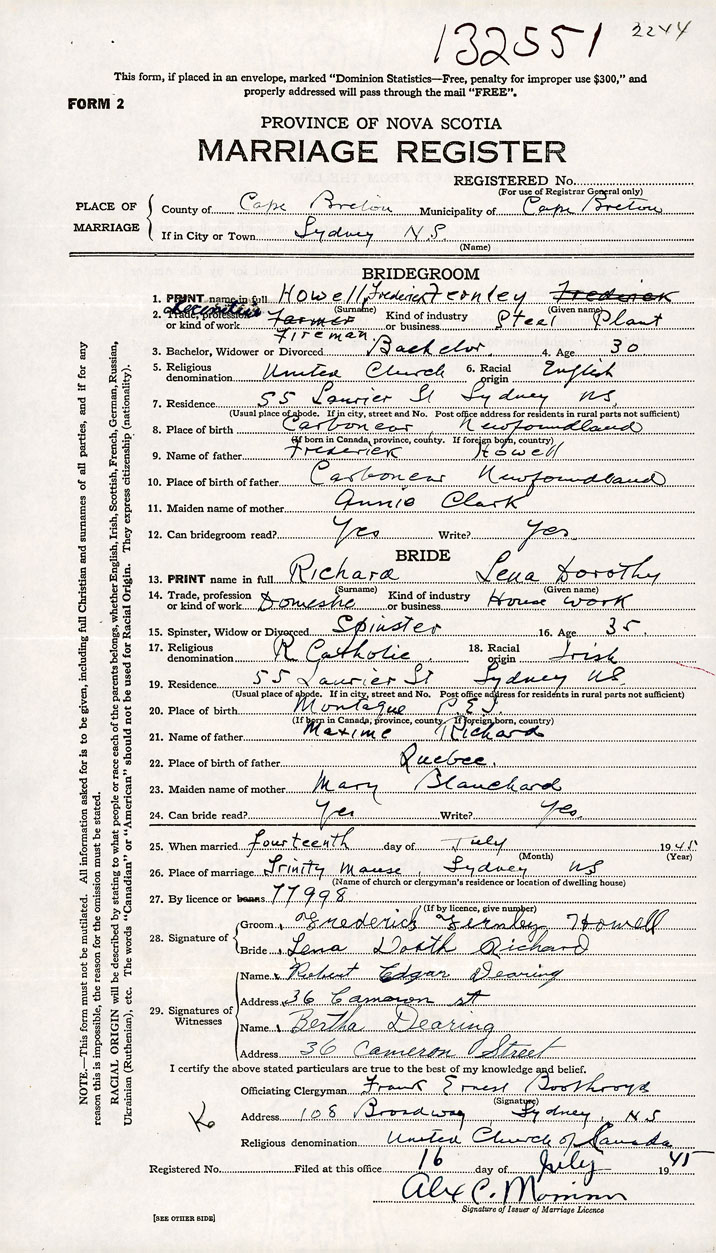 PLACE OF MARRIAGE County of Cape Breton in City or Town Sydney