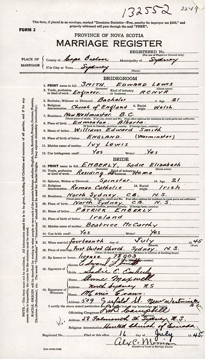 26. Place of marriage First United Church Sydney, Cape Breton County