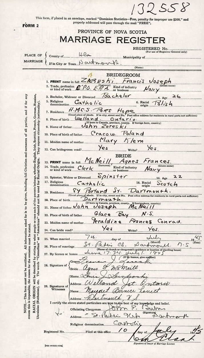 26. Place of marriage St. Peter's Churck Dartmouth, Halifax County