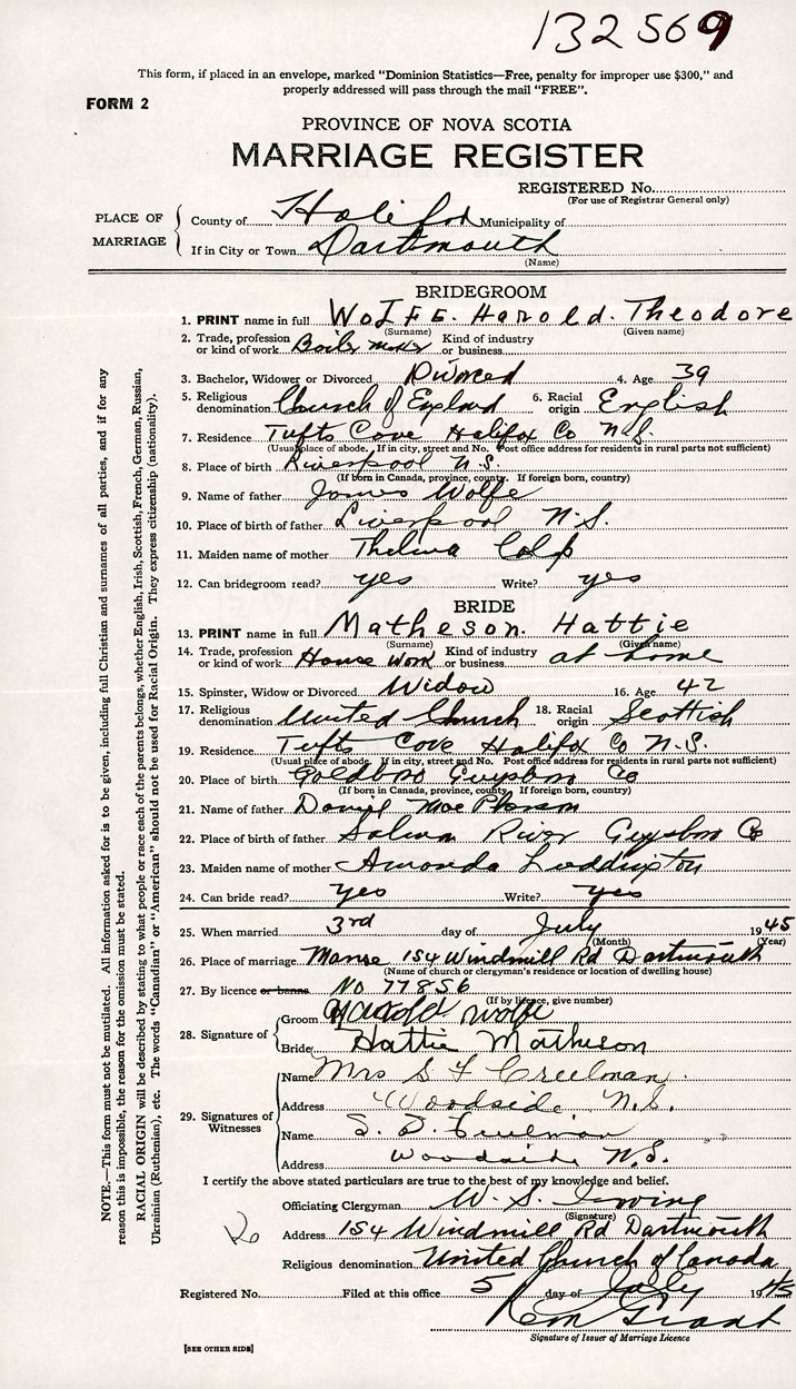26. Place of marriage Manse, 154 Windmill Road Dartmouth, Halifax County