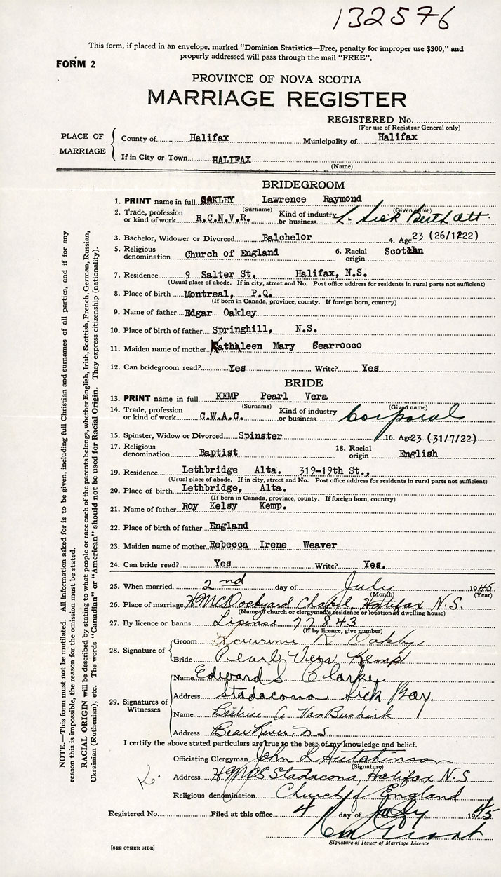 26. Place of marriage H.M.C.S. Dockyard Chapel Halifax, Halifax County