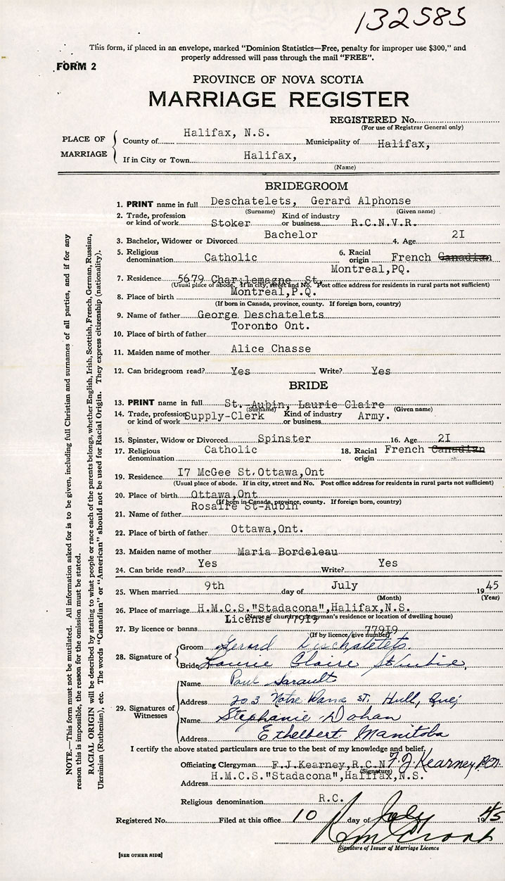 26. Place of marriage H.MC.S. Stadacona Halifax, Halifax County