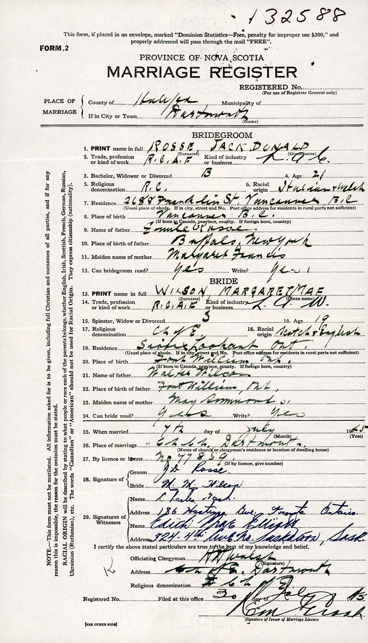 PLACE OF MARRIAGE County of Halifax in City or Town Dartmouth