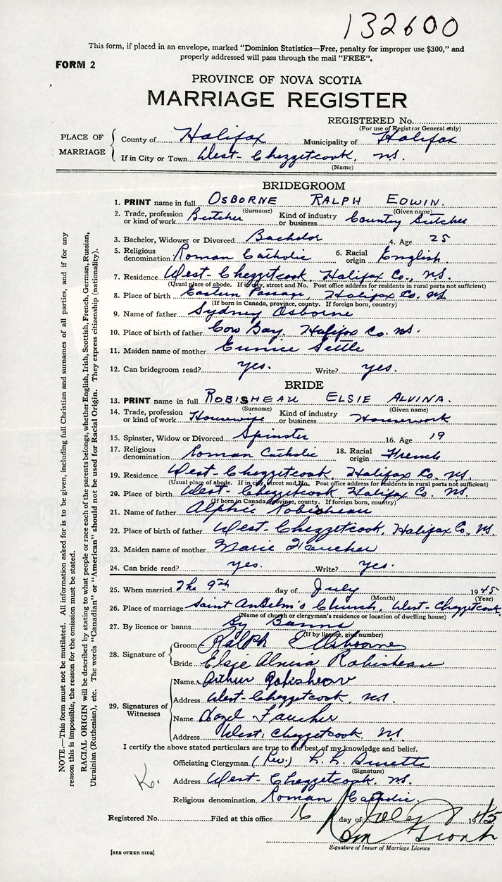 26. Place of marriage St Anselms Church West Chezzetcook, Halifax County