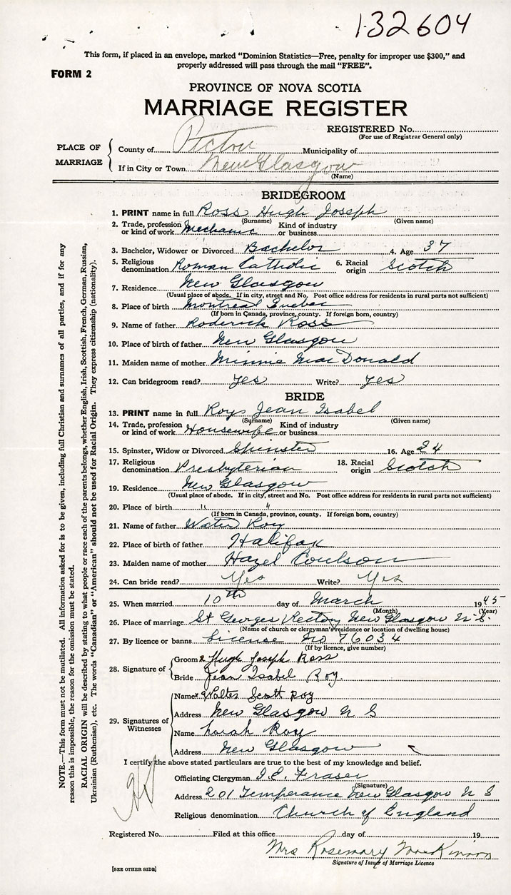 According to a certified copy of the Decree Absolute for Divorce dated 1957-9-13 and filed in the Office of the Registrar General under Divorce number 1547, it is ordered that the marriage of Hugh Joseph Ross and Jean Isabel Roy (Registered under marriage number 1945-132604) be null and void.