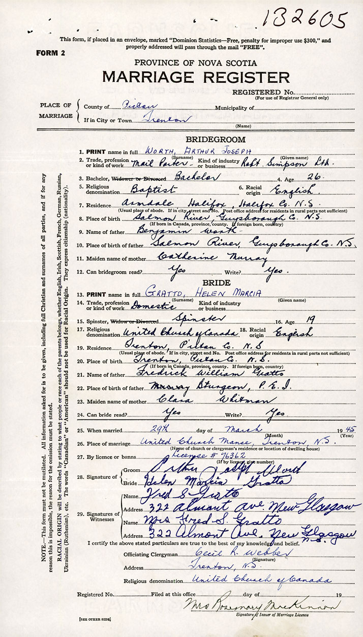 26. Place of marriage United Church Manse Trenton, Pictou County