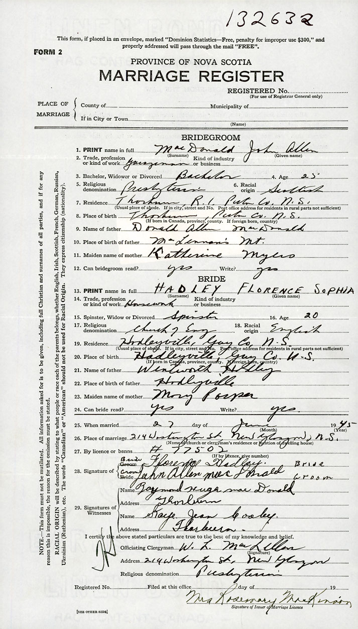 26. Place of marriage 214 Washington Street New Glasgow, Pictou County