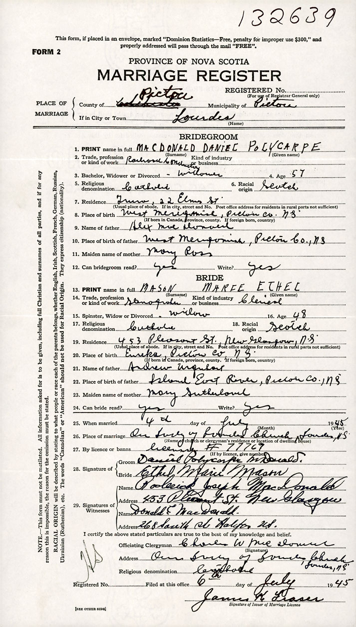 PLACE OF MARRIAGE County of Pictou in City or Town Lourdes