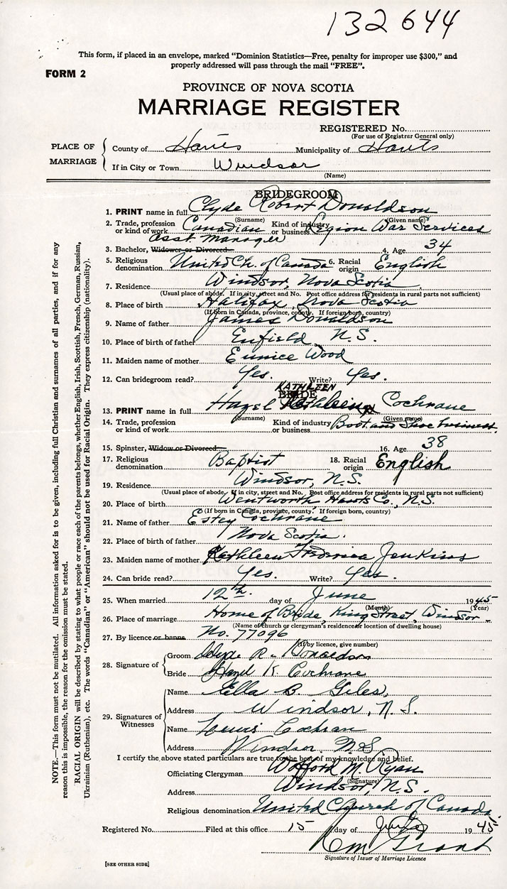 PLACE OF MARRIAGE County of Hants in City or Town Windsor