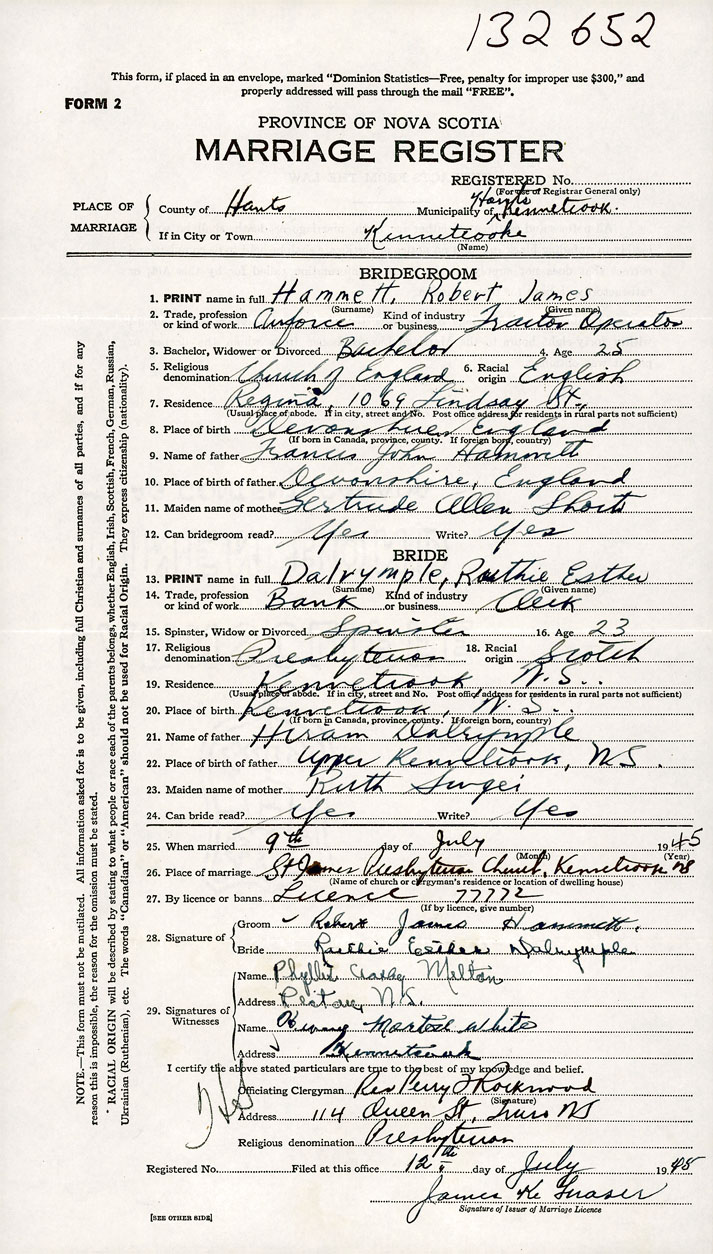 26. Place of marriage St .James Presbyterian Church Kennetcook, Hants County