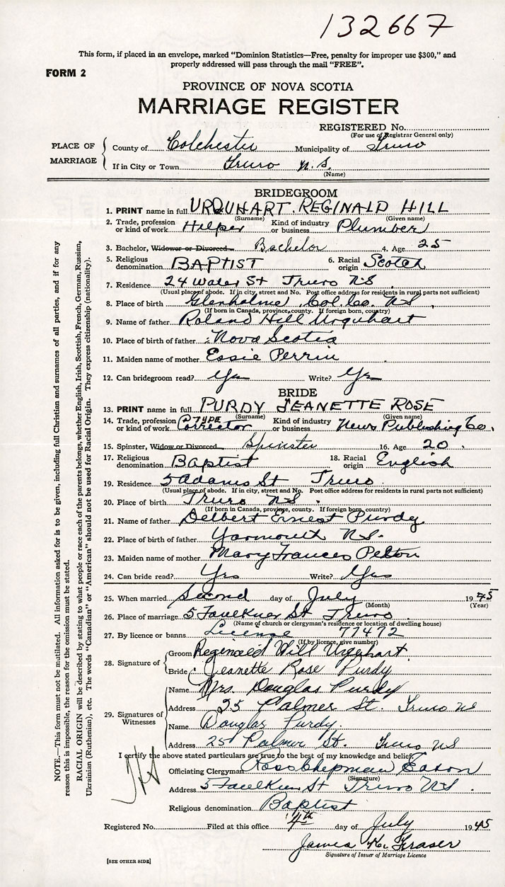 26. Place of marriage 5 Faulkner Street Truro, Colchester County