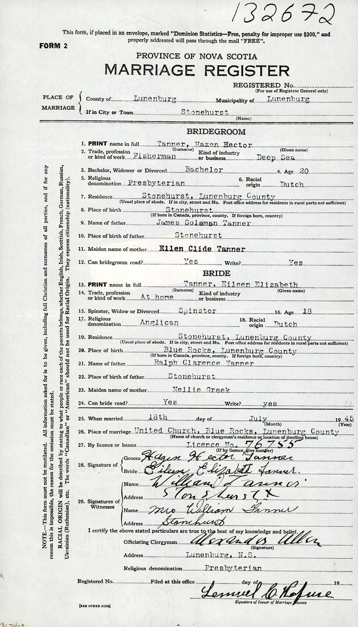PLACE OF MARRIAGE County of Lunenburg in City or Town Blue Rocks