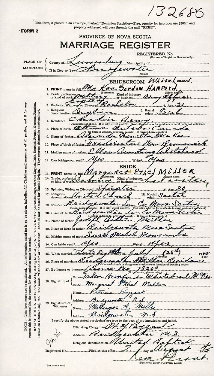 PLACE OF MARRIAGE County of Lunenburg in City or Town Bridgewater