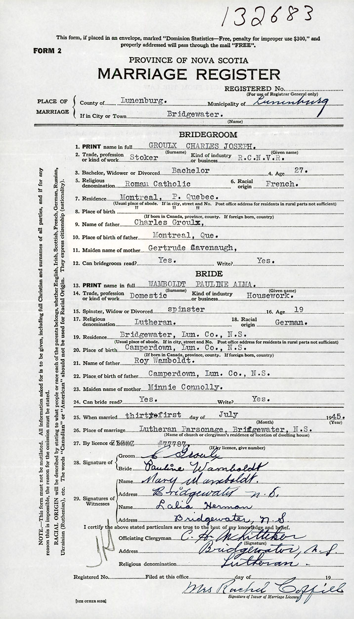 PLACE OF MARRIAGE County of Lunenburg in City or Town Bridgewater