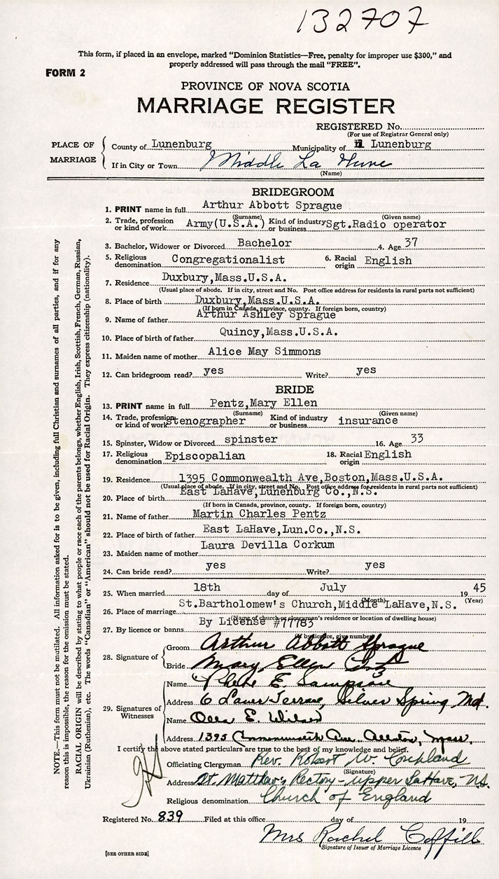 PLACE OF MARRIAGE County of Lunenburg in City or Town Middle LaHave