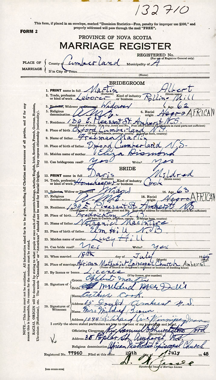 26. Place of marriage African Methodist Episcopal Church Amherst, Cumberland County