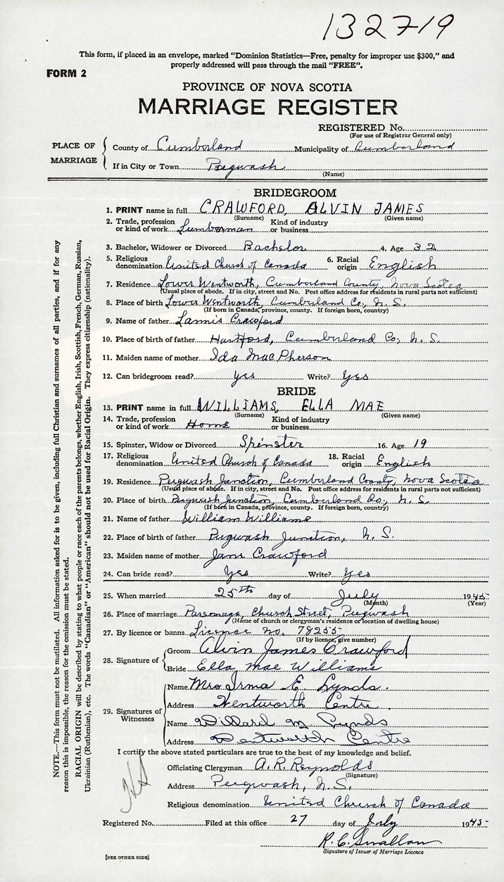 PLACE OF MARRIAGE County of Cumberland in City or Town Pugwash