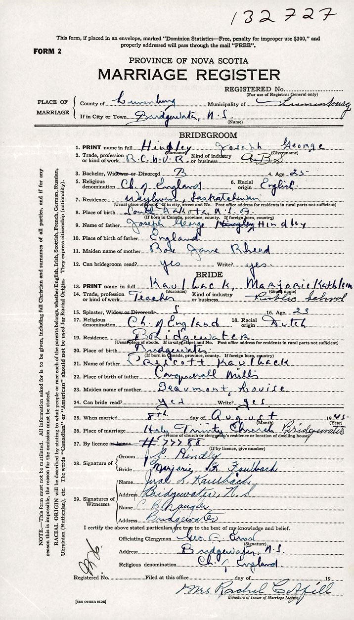 PLACE OF MARRIAGE County of Lunenburg in City or Town Bridgewater