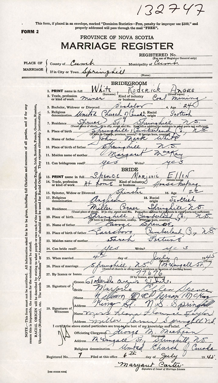 26. Place of marriage McDougall Street Springhill, Cumberland County