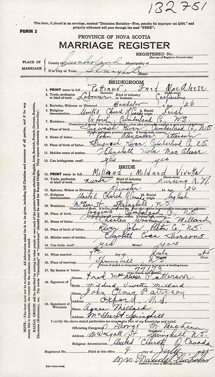 PLACE OF MARRIAGE County of Cumberland in City or Town Springhill