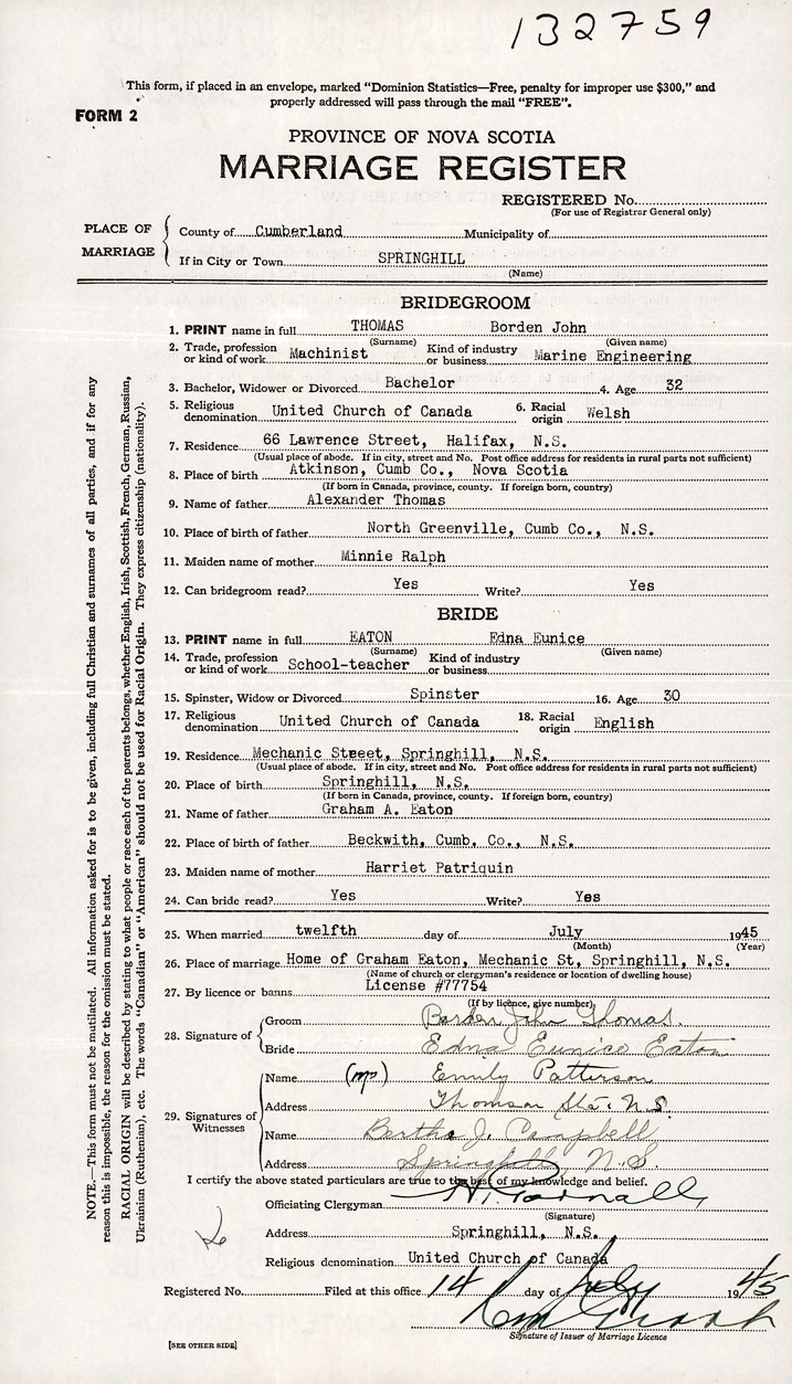 26. Place of marriage Mechanic Street, Home of Graham Eaton Springhill, Cumberland County