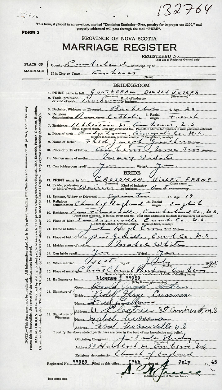 According to a certified copy of the Decree Absolute for Divorce dated 1966-8-9 and filed in the Office of the Registrar General under Divorce number 66-001339, it is ordered that the marriage of Donald Joseph Gouthreau and Violet Ferne Crossman (Registered under marriage number 1945-132764) be null and void.