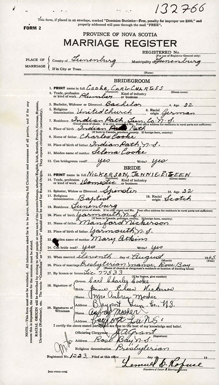 According to a certified copy of the Decree Absolute for Divorce dated 1956-3-14 and filed in the Office of the Registrar General under Divorce number 132766, it is ordered that the marriage of Carl Charles Cooke and Jennie Eileen Nickerson (Registered under marriage number 1945-132766) be null and void.