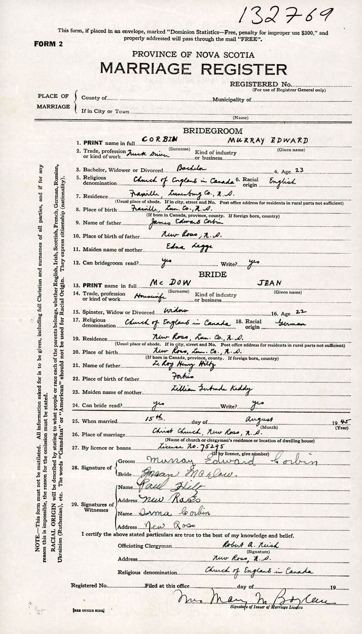 PLACE OF MARRIAGE County of Lunenburg in City or Town New Ross