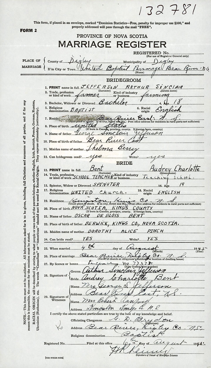 26. Place of marriage Bear River, Digby County