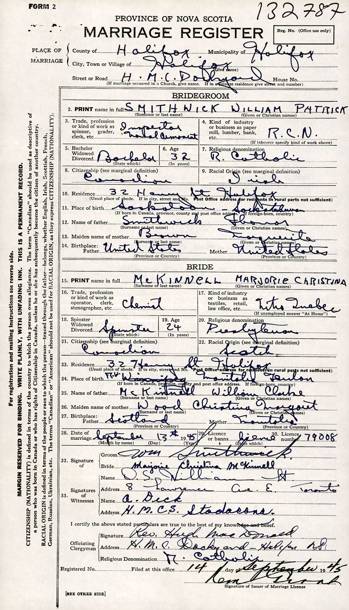 26. Place of marriage HMC Dockyard Halifax , Halifax County