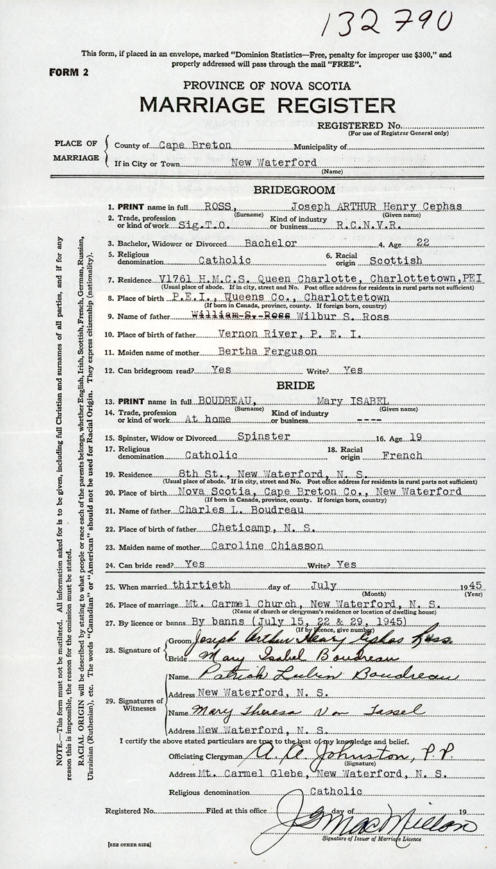 PLACE OF MARRIAGE County of Cape Breton in City or Town New Waterford