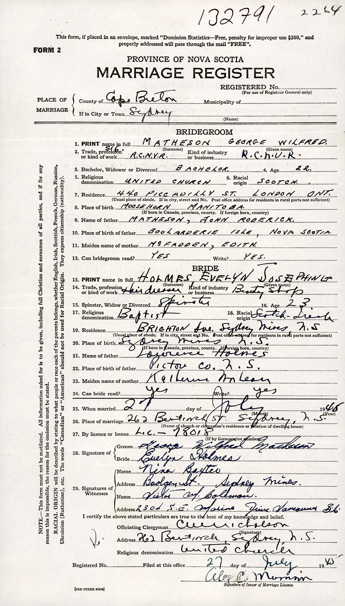 26. Place of marriage 262 Bentinck St. Sydney, Cape Breton County