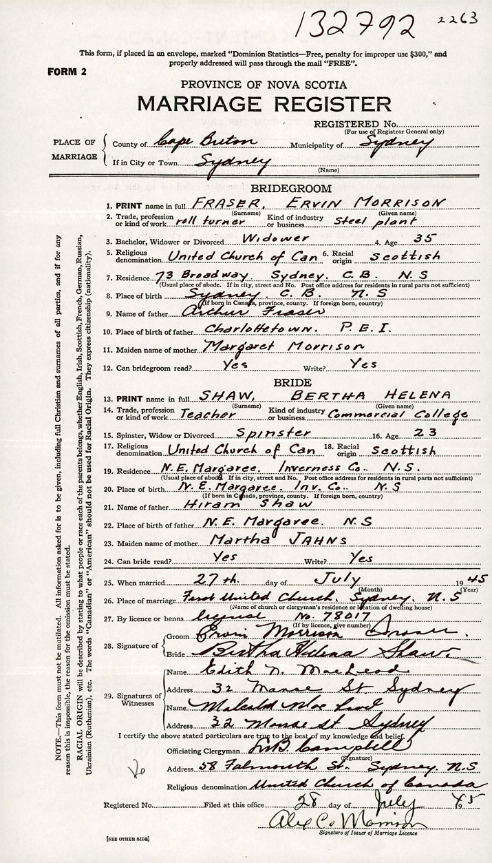 26. Place of marriage First United Church Sydney, Cape Breton County