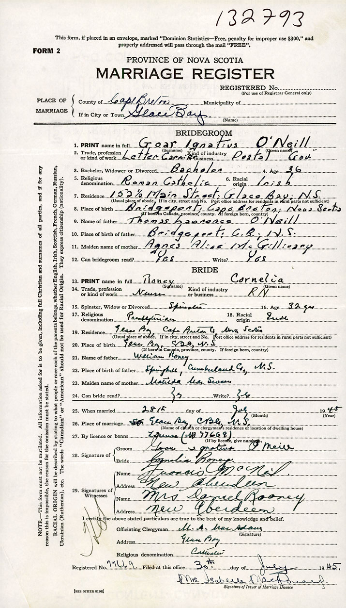 26. Place of marriage Nova Scotia Glace Bay, Cape Breton County