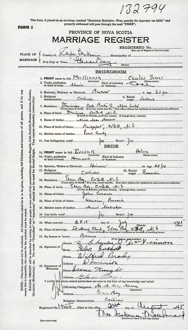 PLACE OF MARRIAGE County of Cape Breton in City or Town Glace Bay