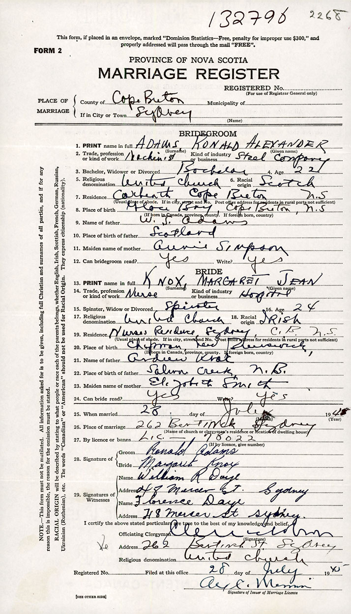 26. Place of marriage 262 Bentinck Street Sydney, Cape Breton County