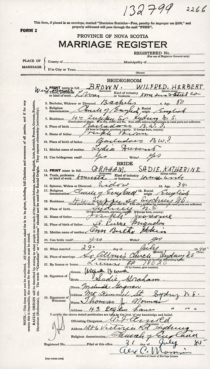 PLACE OF MARRIAGE County of Cape Breton in City or Town Sydney