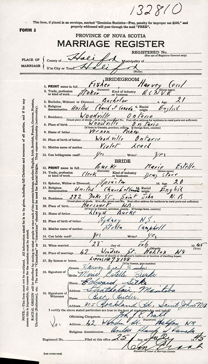 26. Place of marriage 42 Windsor Street Halifax, Halifax County